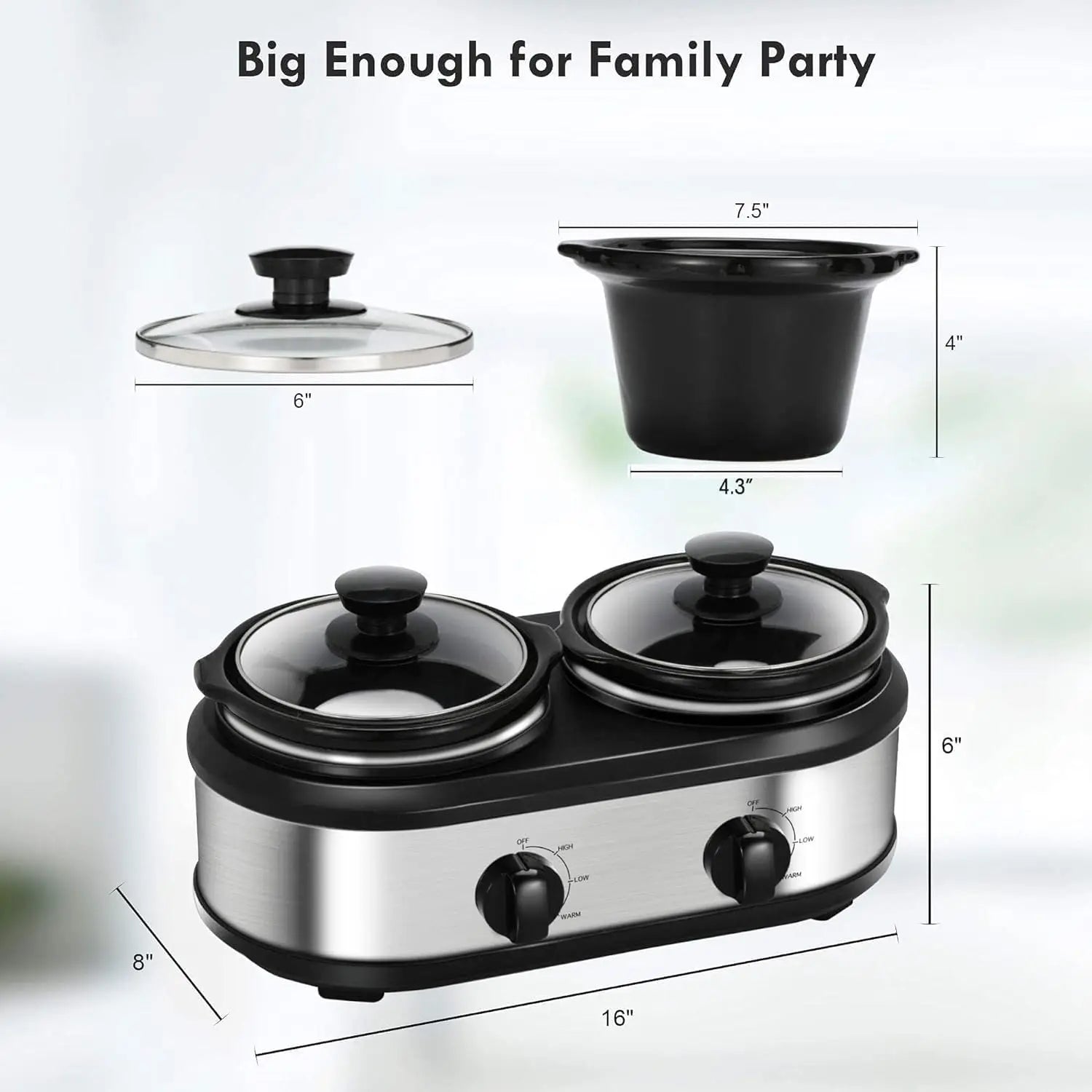 Outer Pot Material: aluminum1. Dual Slow Cooker Buffet Server Food Warmer with 3 Adjustable Temperature Modes, Double Slow Cooker with 1.5 QT Ceramic Pot and Removeable Glass Lid, Dishwasher Safe, Stainless Steel