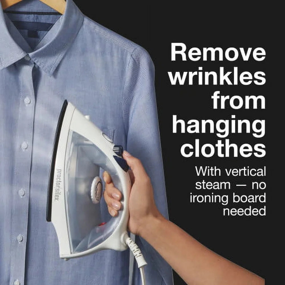 QUICKLY REMOVE WRINKLES FROM HANGING CLOTHES: Freshen clothes and loosens wrinkles right on the hanger with the vertical steam function on the clothes iron — no ironing board needed.